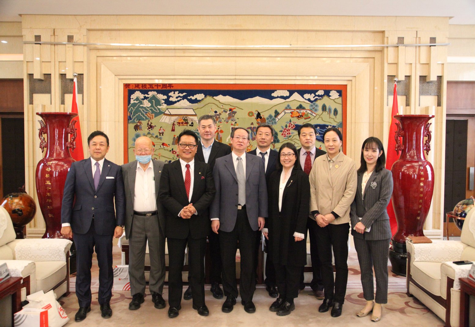 4月13日上午,日本中国友好协会代理理事长揚原安麿一行7人来今年会交流访问,党委副书记、常务副校长高峰会见代表团。
