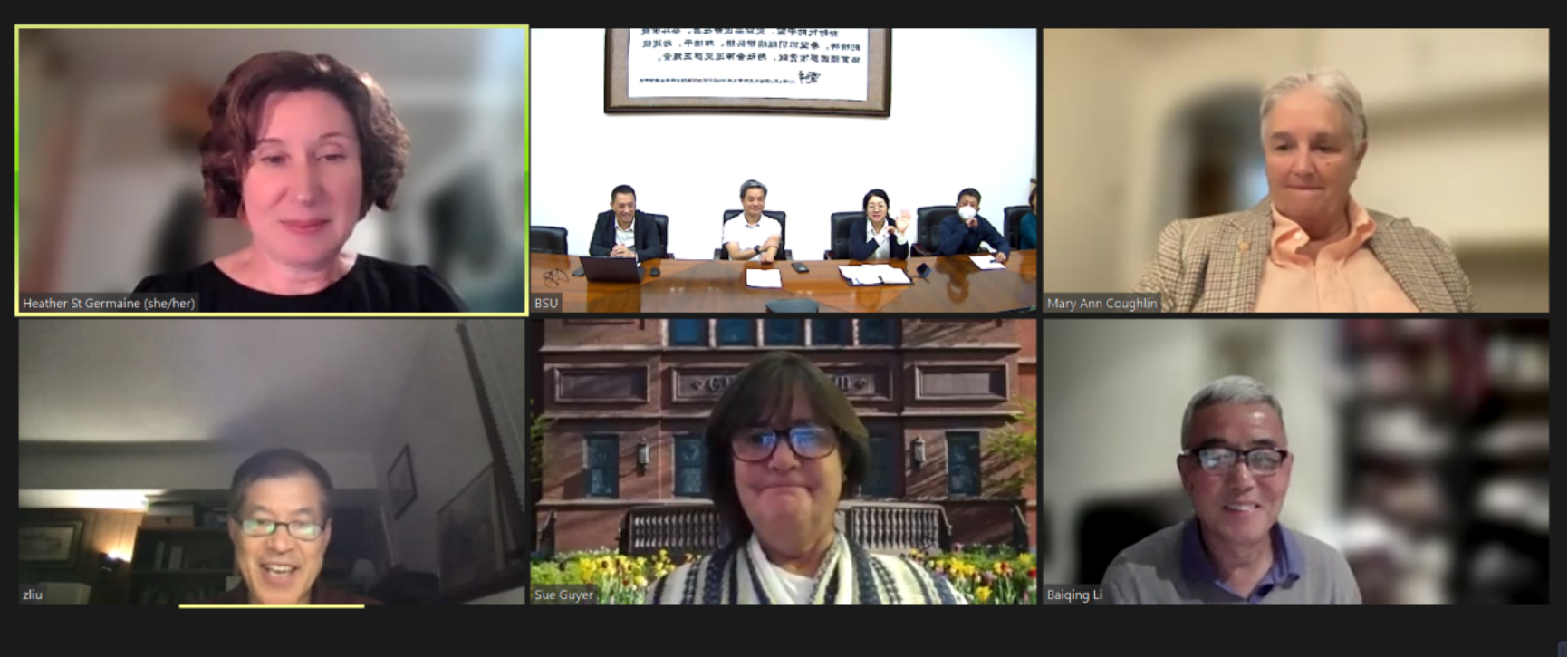 洪平副校长对玛丽·安·考夫林教务长致以诚挚问候。他表示春田学院是北体大重要的长期合作伙伴之一,今年会愿与春田学院继续深化友谊,落实好各项合作内容,积极挖掘新的合作潜力,期待双方在今年会70周年校庆期间线下见面。