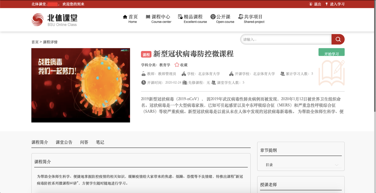 延期开学期间,学校迅速响应《教育部关于在疫情防控期间做好普通高等学校在线教学组织与管理工作的指导意见》等文件精神,面向本科生开设“传染性疾病与公共卫生”课程,受到了广泛关注。近日,我们又将在“北体课堂”平台推出“新型冠状病毒防控系列微课程”供本科生修读。该系列微课程由国家开放大学数字化学习资源中心设计开发,旨在引导学生系统掌握新型冠状病毒防控相关知识,提升自我防范意识和防护能力,帮助学生理性看待疫情,正确应对考验,积极防护,科学战“疫”。