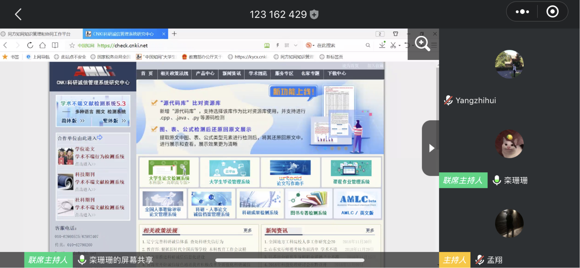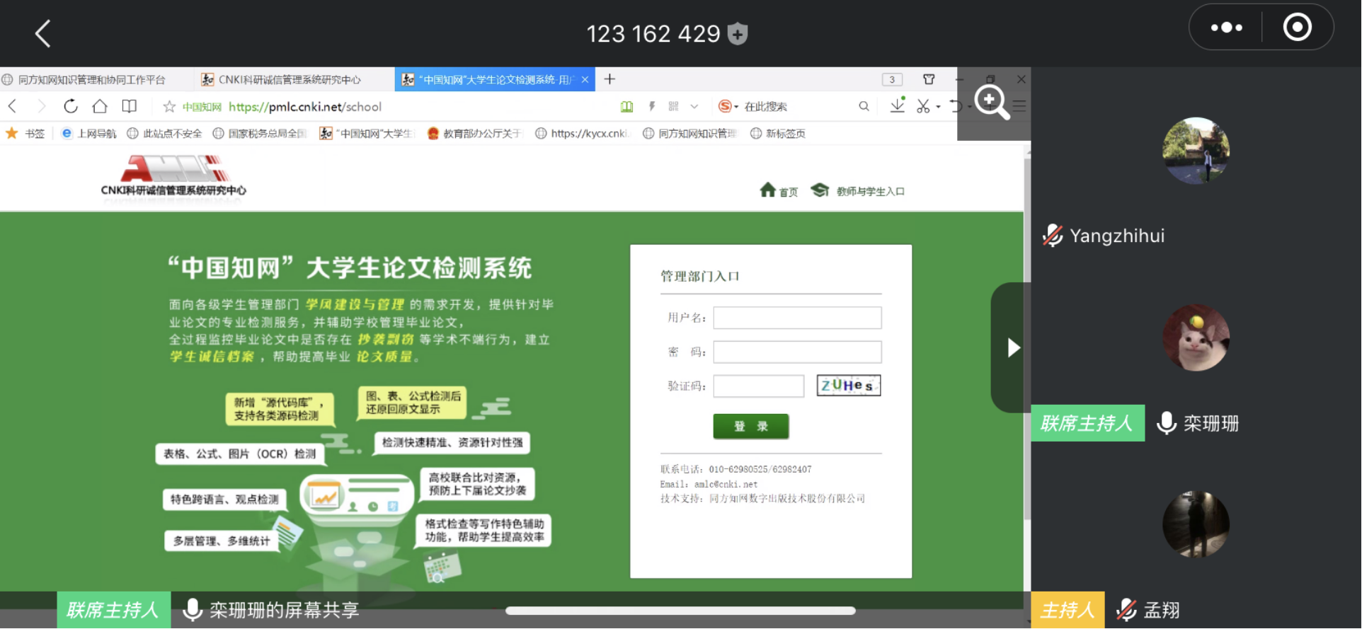 培训会首先由杨之慧副处长对工作坊的模式进行了简要介绍,并对本科生毕业论文查重工作要点进行了强调,提出在疫情防控特殊时期,克服不利因素、保证论文质量、保障毕业论文工作如期完成的目标。随后,中国知网的工程师栾珊珊向参会人员介绍了毕业论文检测系统的使用操作流程,逐步演示并解答了一些关于上传师生信息、选择检测方式、筛选查重结果等具体问题。中国武术学院王艳屏老师应邀对论文检测工作进行经验交流分享,她从实际使用角度出发,帮助解答老师们在使用过程中可能遇到的问题和困难。最后,分享嘉宾、教务处实践教学科的老师对学院教务老师们的提问进行了答疑。