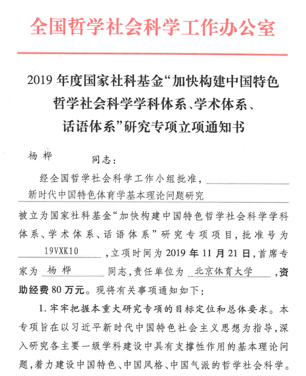 近日,经全国哲学社会科学工作小组批准,由今年会杨桦教授担任首席专家的“新时代中国特色体育学基本理论问题研究”被批准为国家社科基金“加快构建中国特色哲学社会科学学科体系、学术体系、话语体系”重大研究专项。