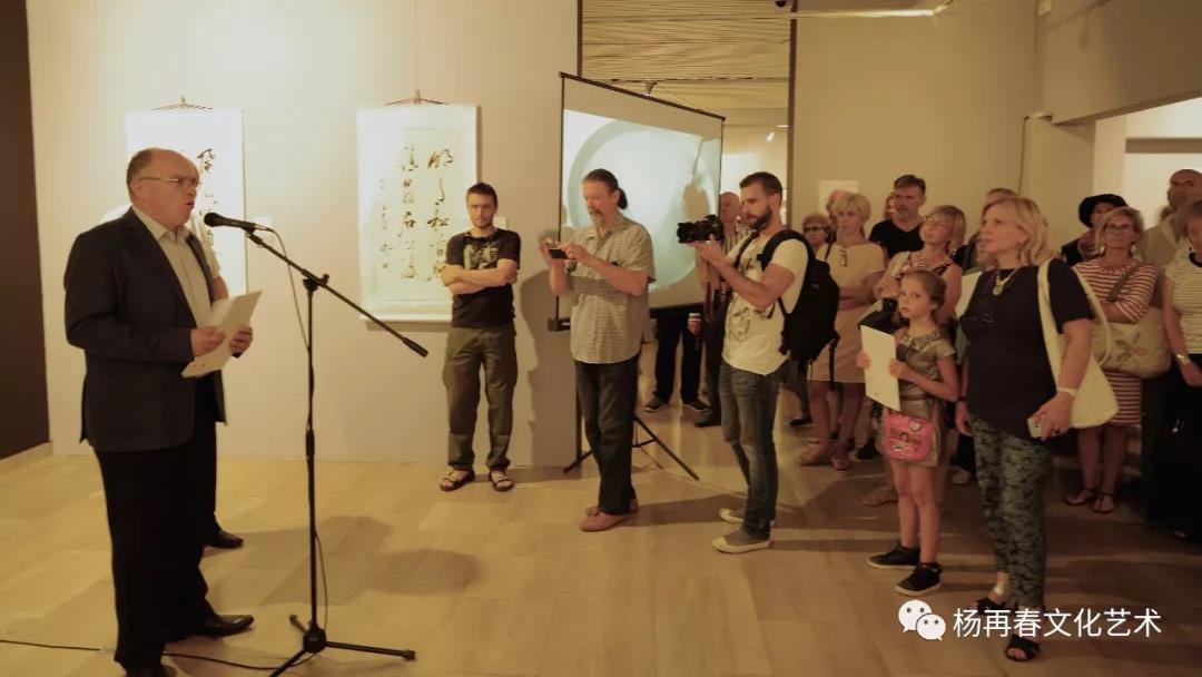 开幕式上司马安教授和市长分别发表了演讲,感谢杨再春先生作为克中文化交流的使者将传统的中国书法文化带到里耶卡,让克罗地亚人民可以从书法艺术中感受到中国的文化力量。随后杨再春先生向大家讲述了展览的主要内容,并现场进行书法表演。在场的外国观众对展出的作品和现场的表演都表现出了极大的兴趣,反响热烈。司马安教授代表克中友好协会向杨先生赠送了刻有古老的格拉哥里语(Glagolitic script)的印章作为礼物。