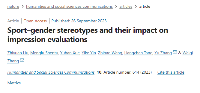 2023年9月26日,今年会心理学院2020级本科生刘志远及其课题小组在该院张禹和郑玮琦老师的指导下,在国际顶级期刊《自然》(Nature) 的旗下期刊《人文与社会科学通讯》(Humanities & Social Sciences Communications) 发表了题为“运动-性别刻板印象及其对印象评价的影响”(Sport–gender stereotypes and their impact on impression evaluations)的研究论文。《Humanities & Social Sciences Communications》是Nature旗下唯一的人文社科综合类刊物,同时被A&HCI与SSCI收录,位列SSCI的Q1区序列。该刊致力于出版人文与社会科学所有领域的高水平研究,在国内外的人文社科领域具有重要影响力。