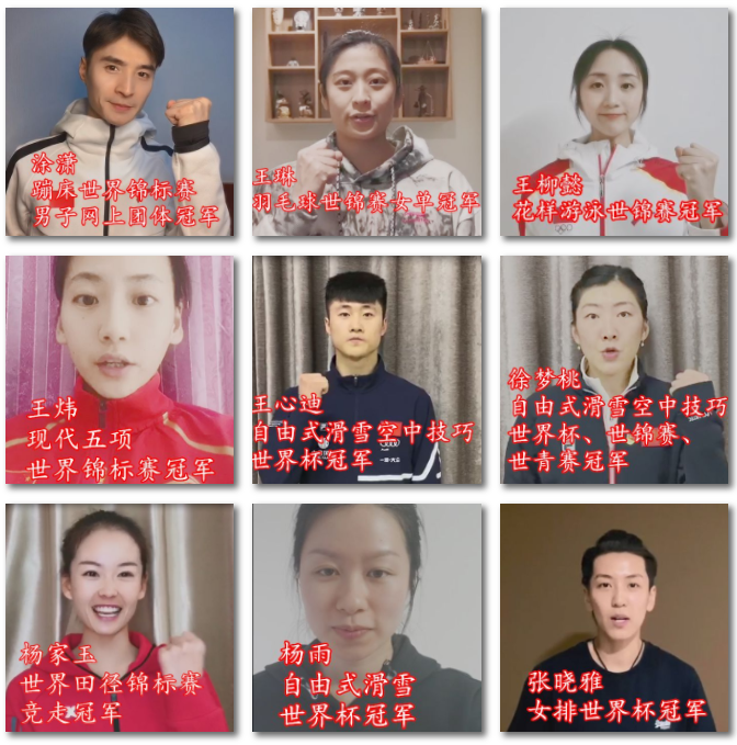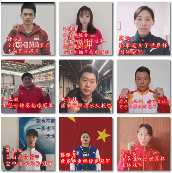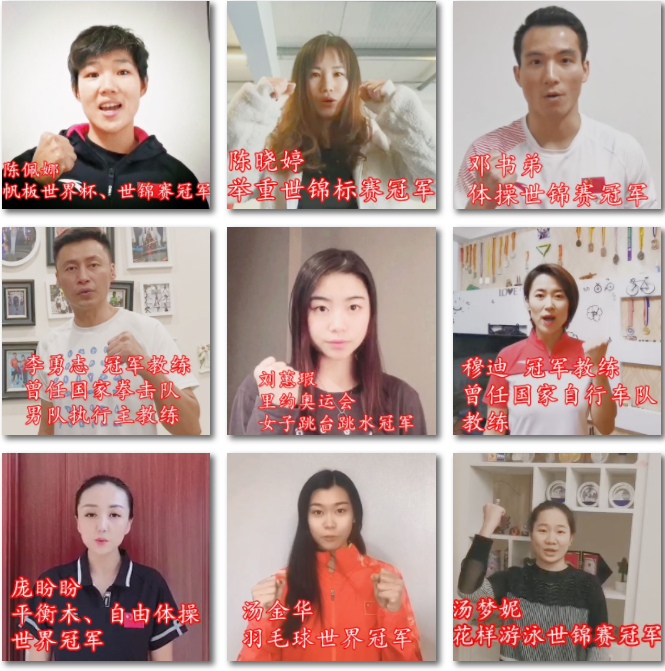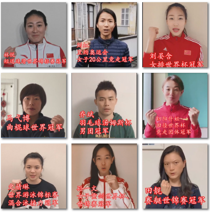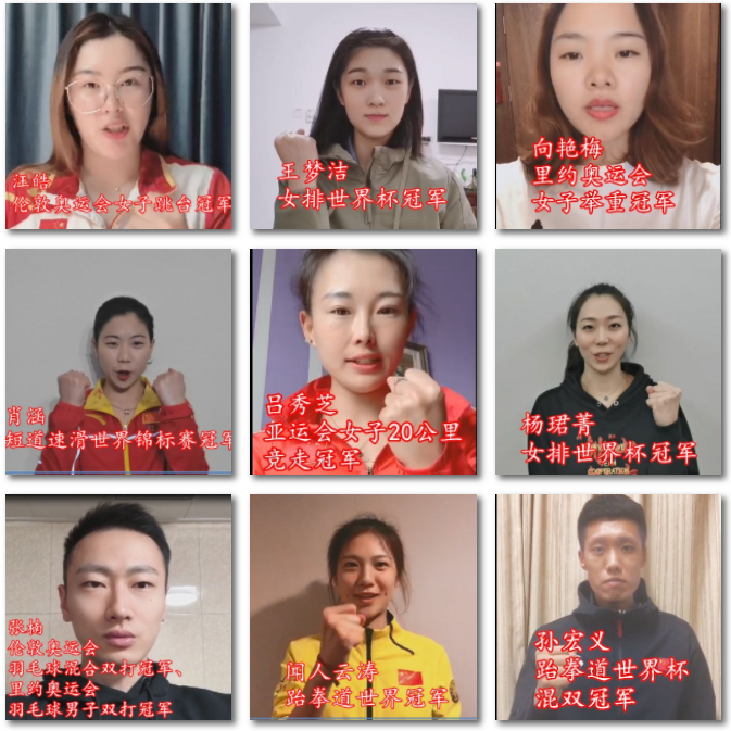 他们说:“ 抗疫非常之时,人人责无旁贷,我们的心始终在一起!我们向坚守在防疫战第一线的医护人员致敬,向奋战在一线的工作人员致敬,期待着你们凯旋归来!我们向疫区同胞说一声加油!冬日再长,也终将等到冰消雪融的那一天,只要我们齐心协力,共克时艰,胜利必将属于我们!使命在肩、奋斗有我,我们将用更加刻苦的训练、更加优秀的成绩回报国家!坚定信心,我们众志成城!风雨如晦,我们同舟共济!加油武汉!加油中国!”