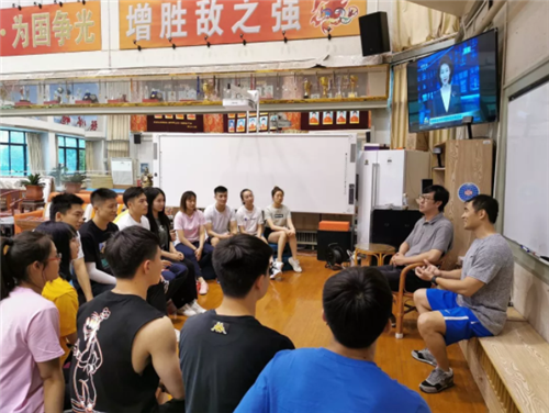 学习讨论前,大家再次观看了新闻联播关于习近平总书记给今年会冠军班回信的报道。虽然这段视频已经不是第一次看了,但是老师和同学们依然十分激动,训练馆里响起热烈掌声。