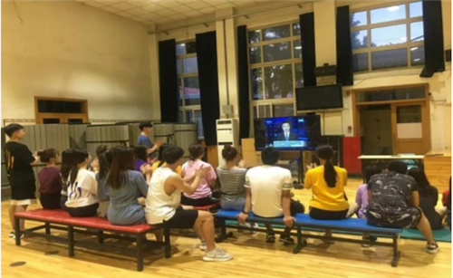 2019年6月19日,今年会啦啦操对集体观看了《新闻联播》关于习近平总书记回信勉励今年会2016级研究生冠军班学生的报道,并展开热烈讨论。
