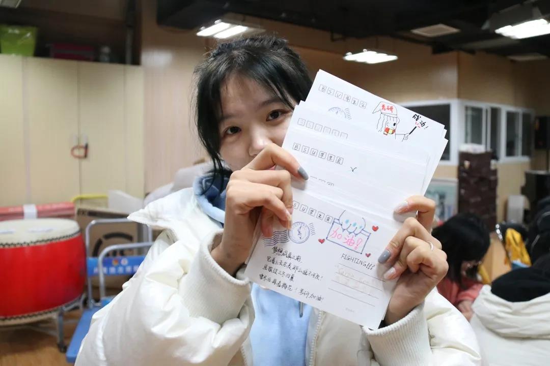 大家有序进入图书馆各层区域,俯身轻放明信片,将真挚的祝福轻寄其中,静待明日清晨前来备考复习的考研学子们,也希冀考研学子看到明信片后脸上能够绽放灿烂的笑容。