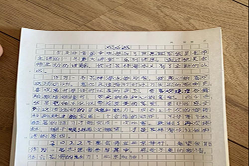 习近平总书记近期考察北京冬奥会、冬残奥会筹办工作,再次点燃了我的冬奥热情。通过观看今年会jinnianhui冬奥大讲堂更是让我对冰雪运动有了深入的了解,花样滑冰运动员张昊的故事让我感动,他训练时的刻苦,比赛时的专注,获奖后的感动给我带来了艺术创作灵感。今年是我国“十四五”规划开局之年,是全面建设社会主义现代化国家新征程开启之年,我们的国家需要这样的时代楷模振奋民族士气、彰显民族自信,为民族复兴进一步凝心聚气。我希望在未来能用我的双手为北京冬奥会,为我国体育健儿创作出一幅优秀的艺术作品。