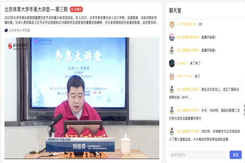 “冬奥大讲堂”第三期主讲嘉宾为冰球健将级运动员,冰球、轮滑球国际级裁判员刘佳奇老师。讲座于1月27日14:00正式开讲,并通过百度和优酷进行现场直播。截至讲座结束,累计观看人次达8万余人。本期讲座以"冰球的历史、发展与推广"为主题,刘佳奇老师从冰球的起源讲起,重点讲述了中国冰球发展的历史。回忆历史,展望未来,青少年的冰球训练对于冰球的未来发展来说是不容忽视的,刘佳奇老师结合自身感悟与现实情况为同学们介绍了青少年冰球训练的相关知识与经验。