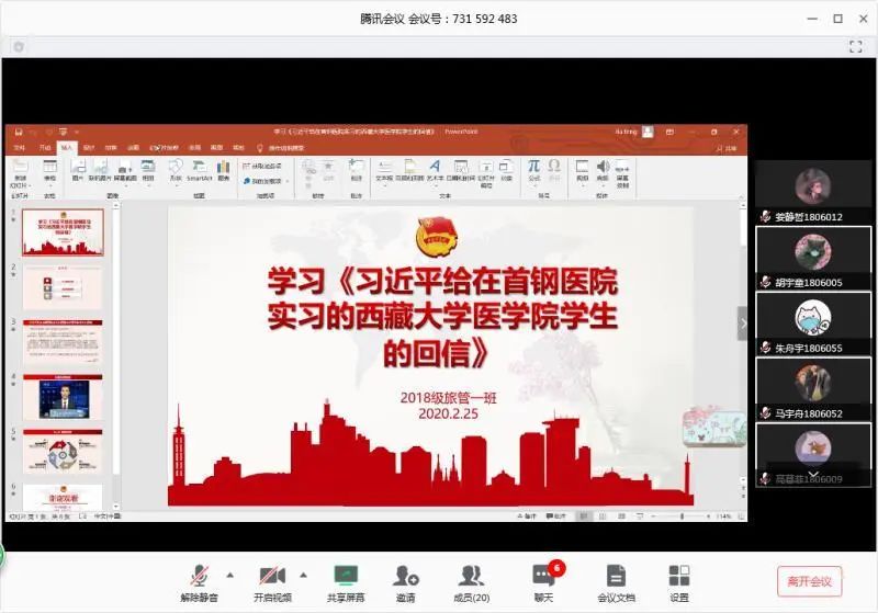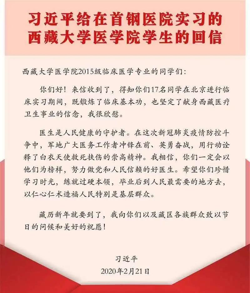 在藏历新年来临之际,中共中央总书记、国家主席、中央军委主席习近平2月21日给正在北京大学首钢医院实习的西藏大学医学院学生回信,肯定他们献身西藏医疗卫生事业的志向,勉励他们练就过硬本领、服务基层人民,并向他们以及藏区各族群众致以节日的问候和美好的祝愿。共青团今年会jinnianhui委员会随即组织全校375个团支部共13000余名团员青年通过视频会议的形式开展线上学习。