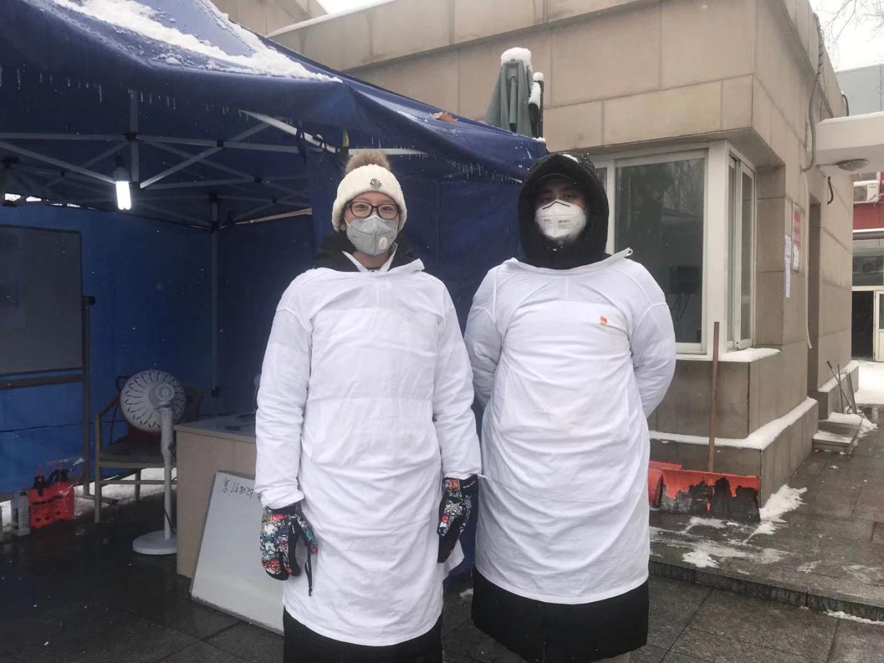 临时党支部副书记温惠深夜与工作人员坚守在家属区门口