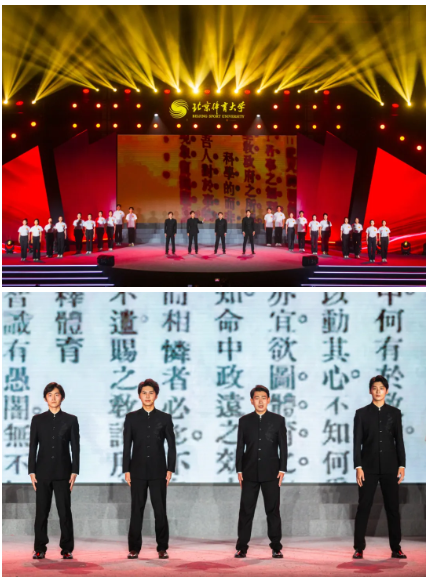北体学子诚挚地为祖国献上祝福。青年学子以坚定之声朗诵《体育之研究》,喊出了“文明其精神,野蛮其体魄”的号召。教师董栋和学生代表带来的歌曲《有我》诉说着北体人“使命在肩、奋斗有我”的责任与担当。一曲《乌尔朵的誓言》,展现了西藏各族人民同呼吸,共命运、心连心的心声。醒龙舞狮、刀枪棍棒,在力量与技巧中传承《尚武精神》。